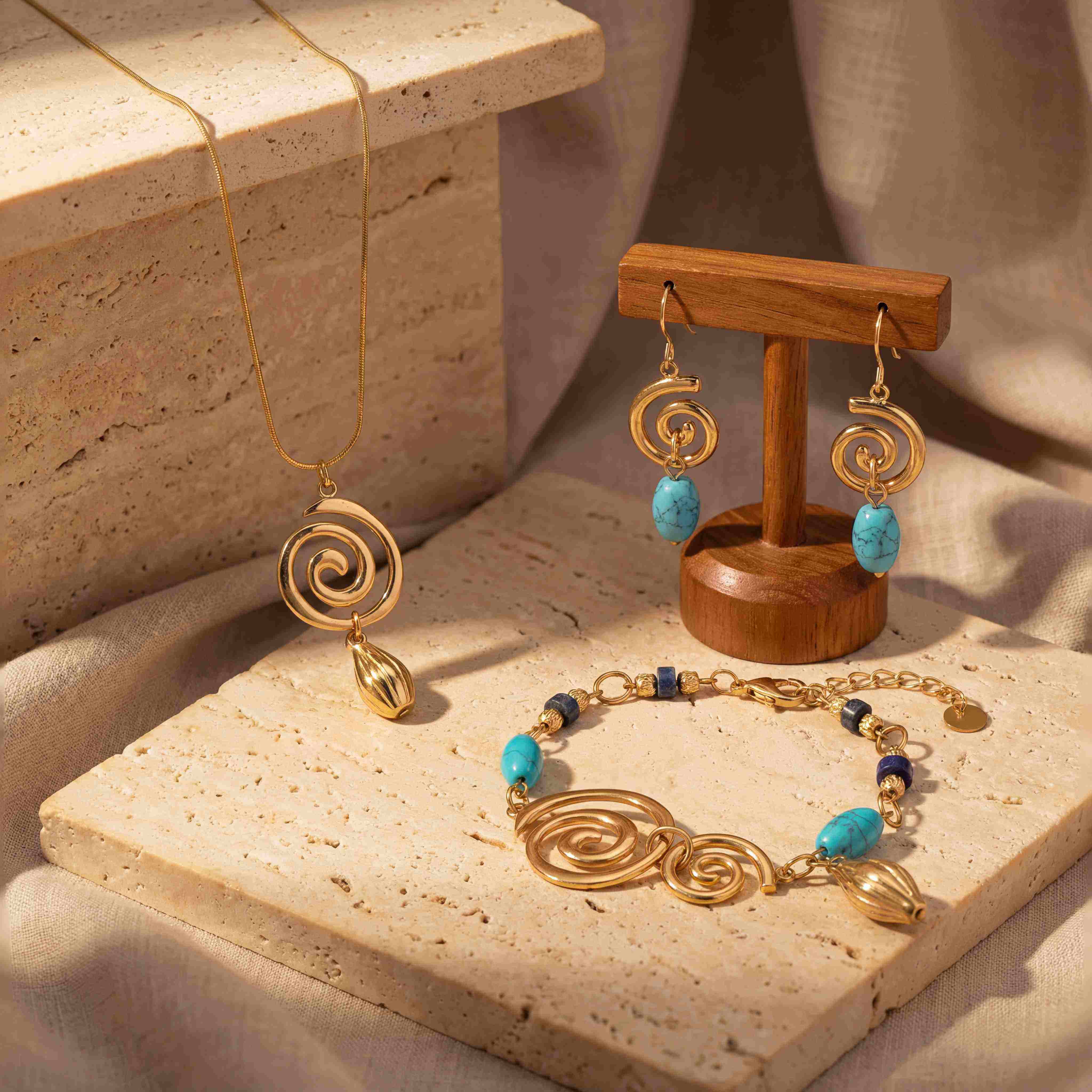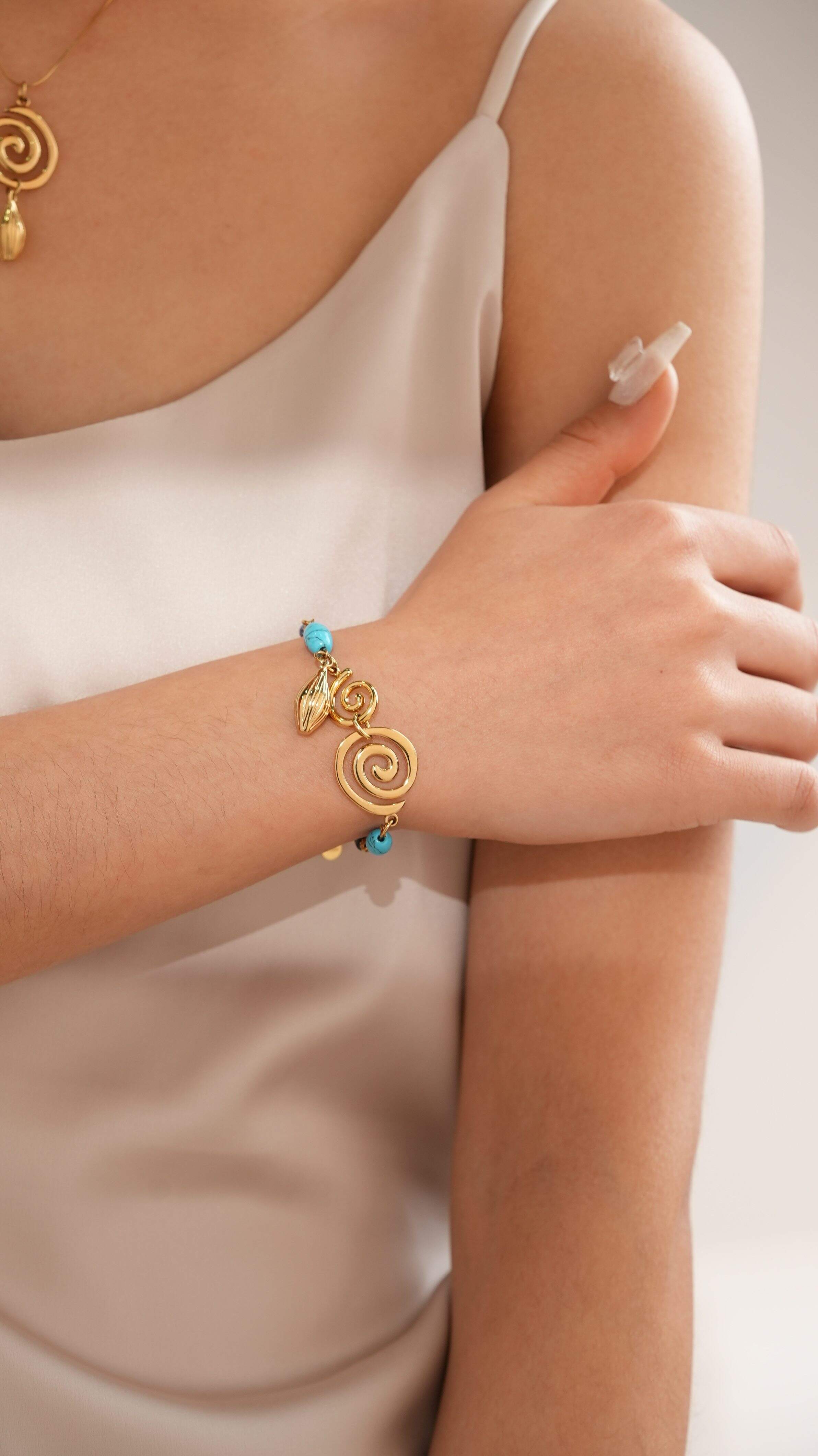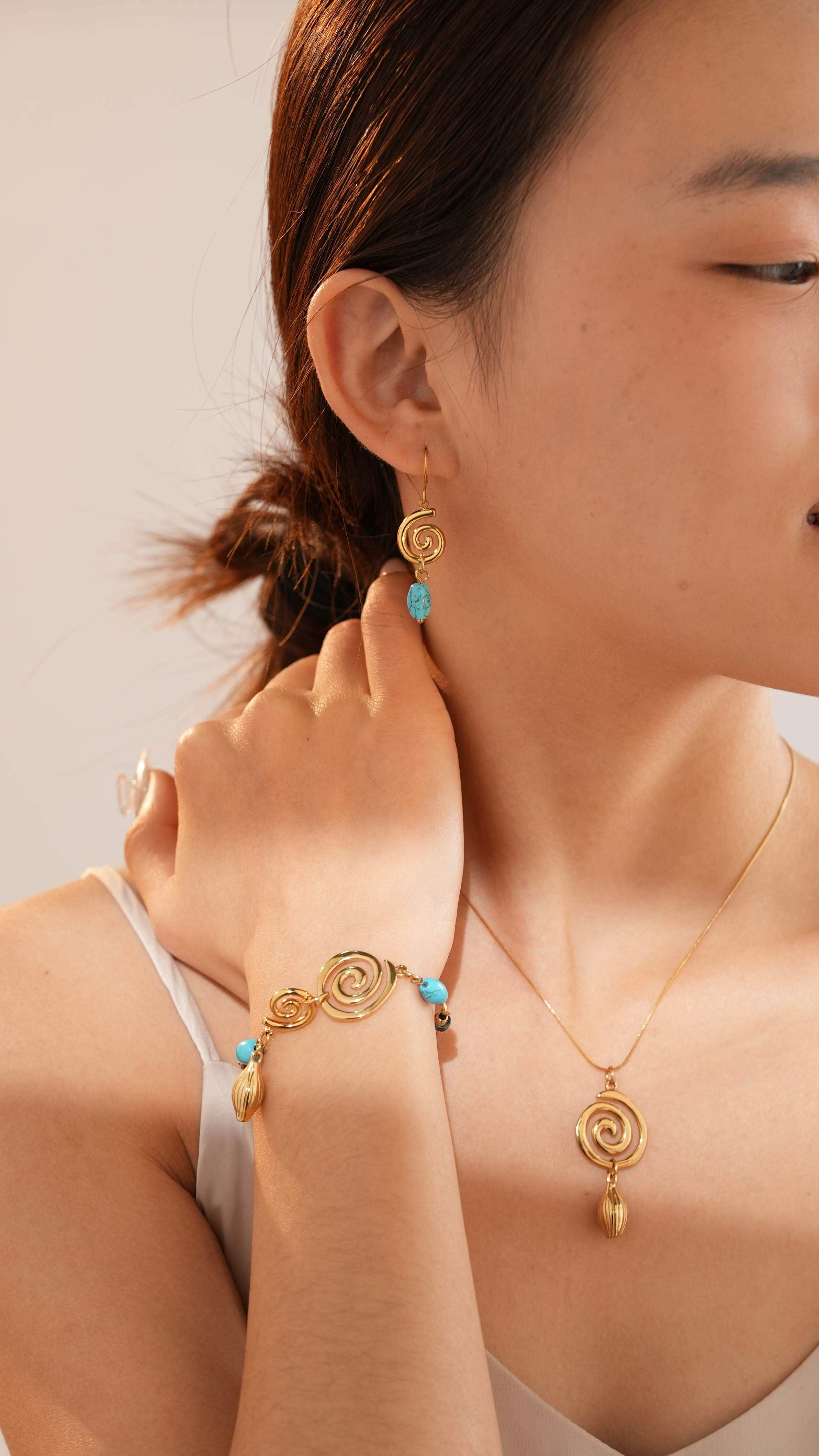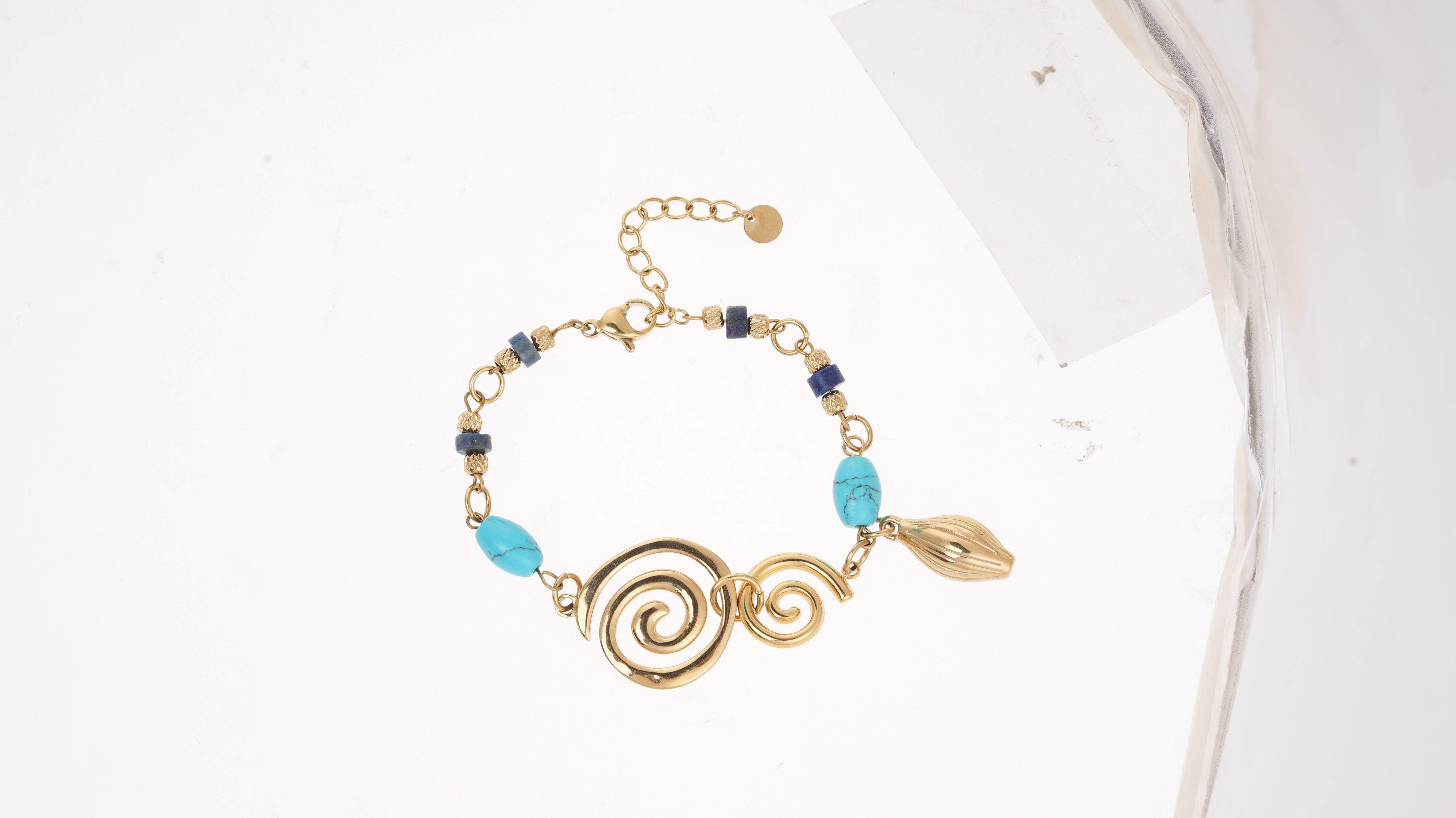 Centered on the "ocean wave vortex" core design, the metal spiral texture perfectly restores the dynamic beauty of surging waves. Selected deep blue lapis lazuli and clear turquoise create a layered visual effect with contrasting colors. Made of hypoallergenic, colorfast stainless steel paired with natural gemstone beads, every detail is hand-polished for an exquisite finish.