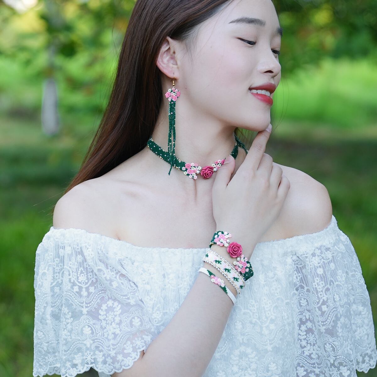 Core Features: Hand-woven floral beadwork + multi-layered tassels, delivering a romantic, one-of-a-kind aesthetic.