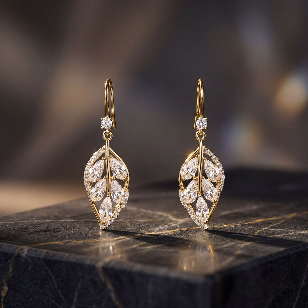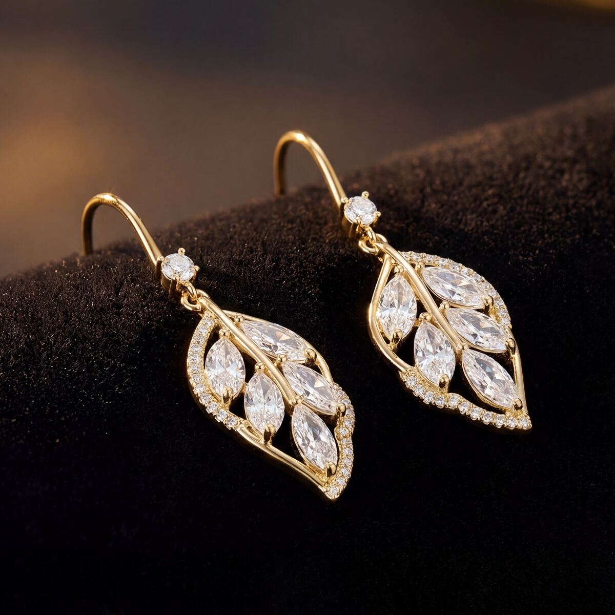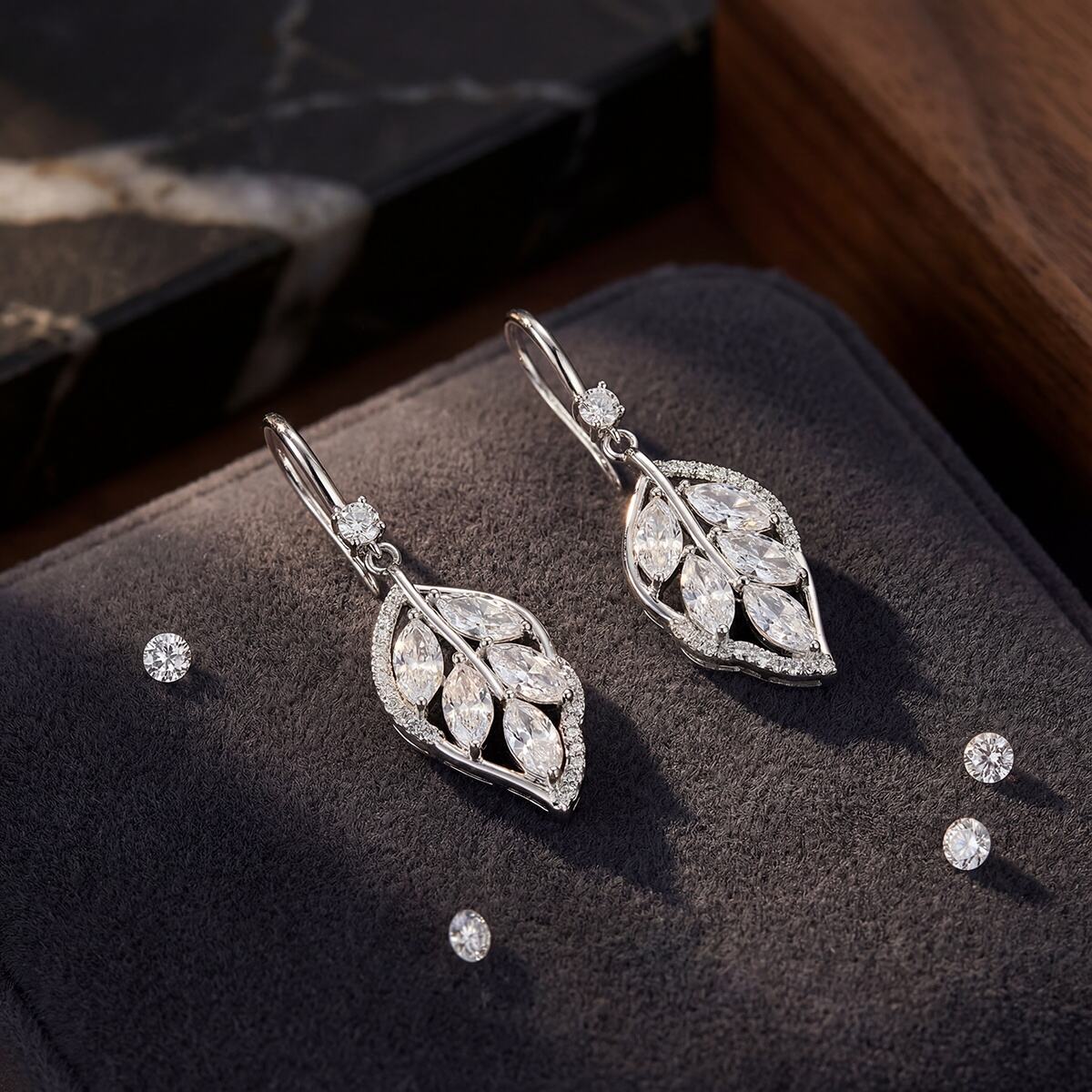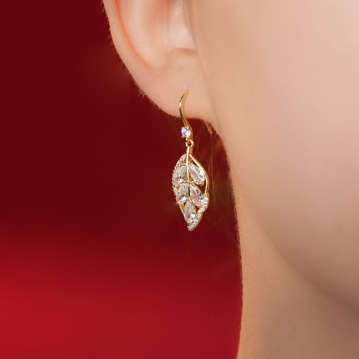 These earrings feature layered inlay craftsmanship: marquise-cut zircons mimic the delicate veins of a leaf, while round zircons are pavé-set along the edges for a 3D, luminous effect. The 925 sterling silver hooks are polished to a smooth, burr-free finish for comfortable wear, and the entire piece is sealed with an electroplated coating to ensure long-lasting color and scratch resistance. In light, the zircons catch and reflect rays from multiple angles, creating a vivid, lifelike sparkle.