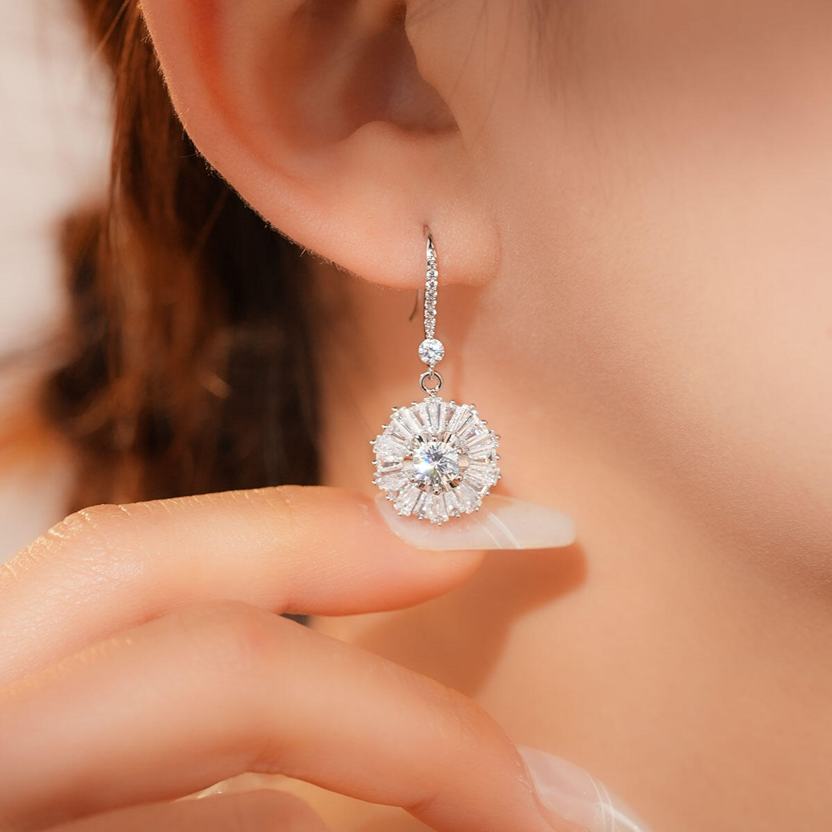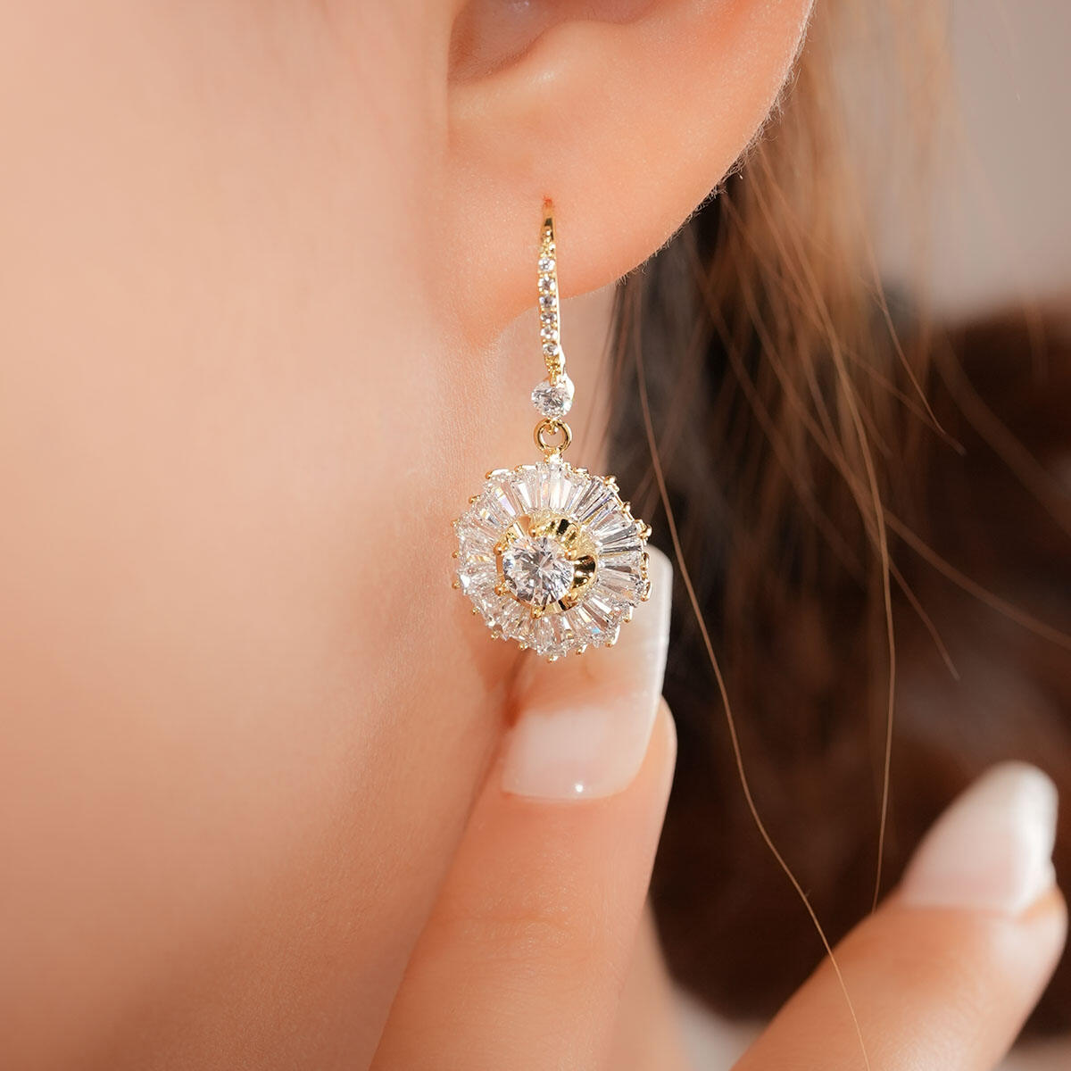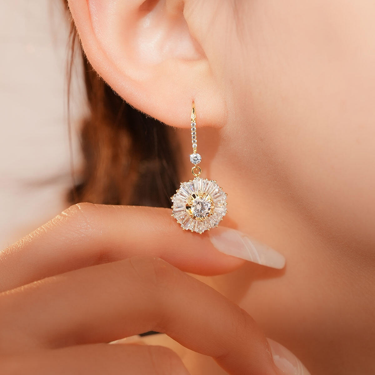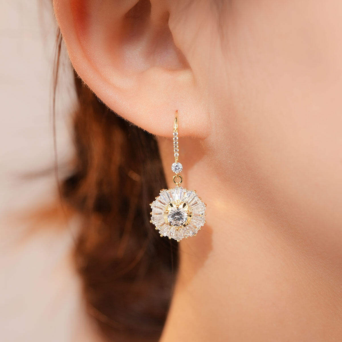 Inspired by summer-blooming sunflowers, these light luxury drop earrings blend timeless elegance with eye-catching sparkle. Crafted from copper plated in 18K gold/rhodium and finished with hypoallergenic 925 sterling silver hooks (perfect for sensitive ears), the sunflower centerpiece features a round CZ core surrounded by radiating baguette CZs. Expert casting, polishing and micro-pavé setting create a 360° shine that glimmers like a tiny sun—with delicate pavé CZs on the hook for a seamless, refined finish.