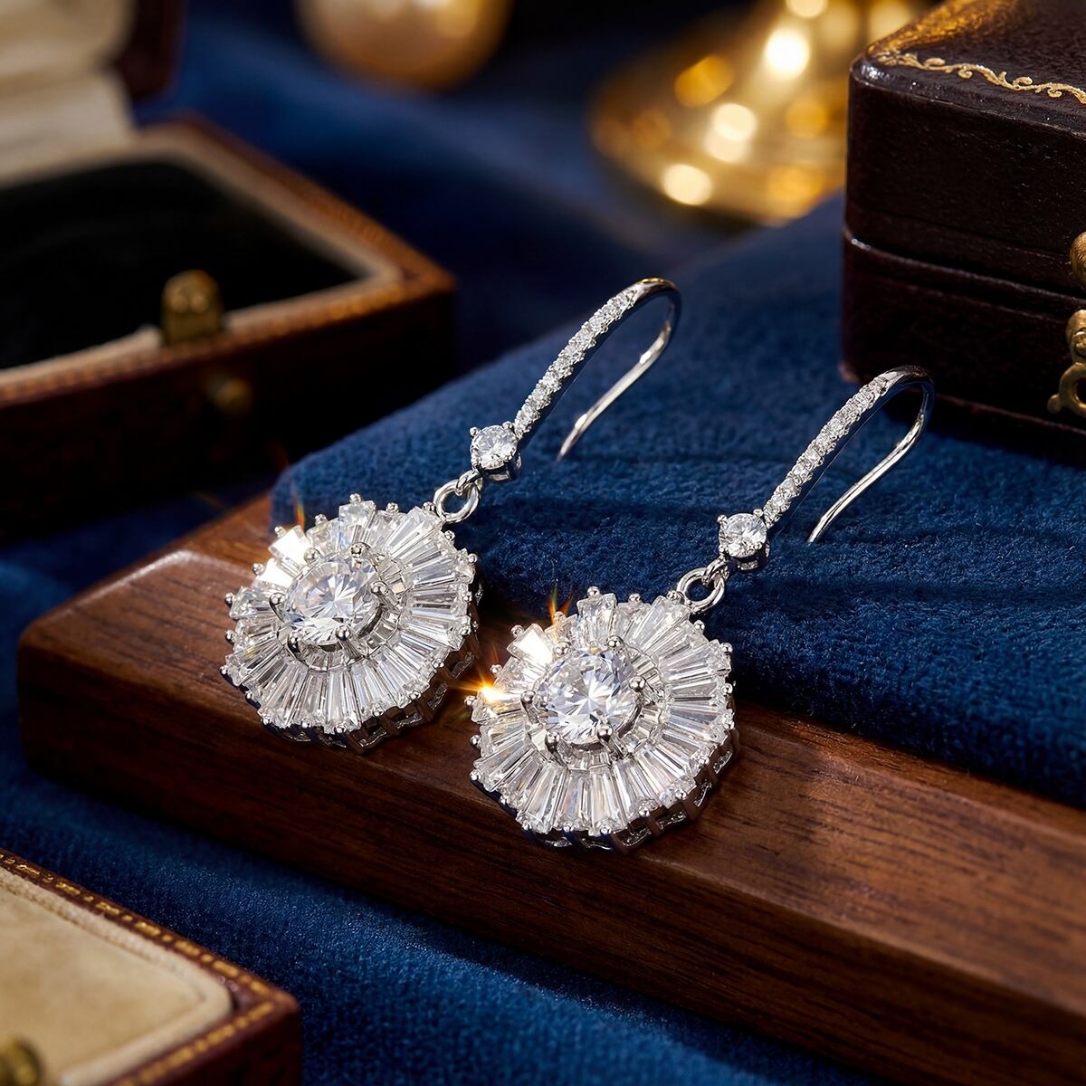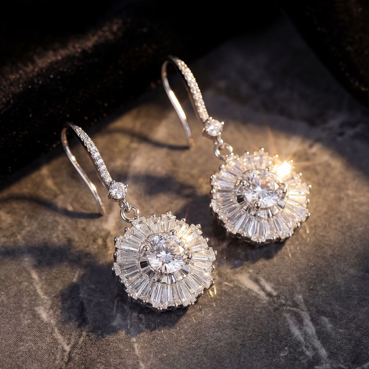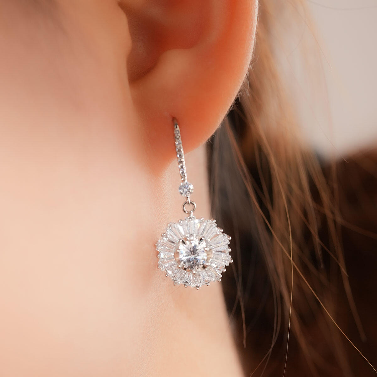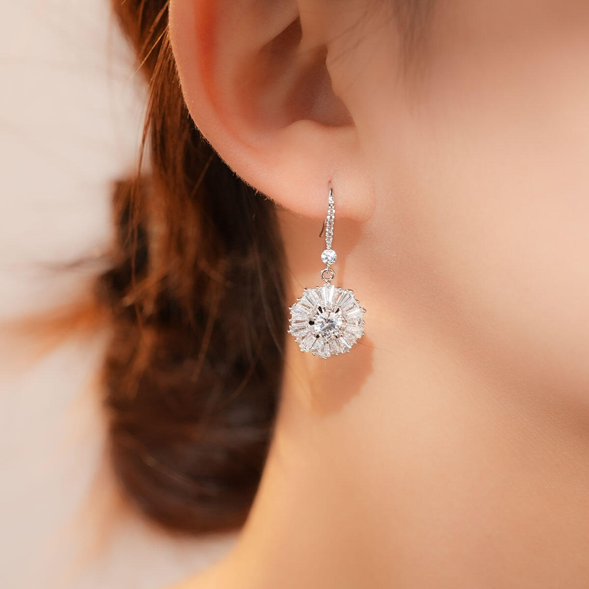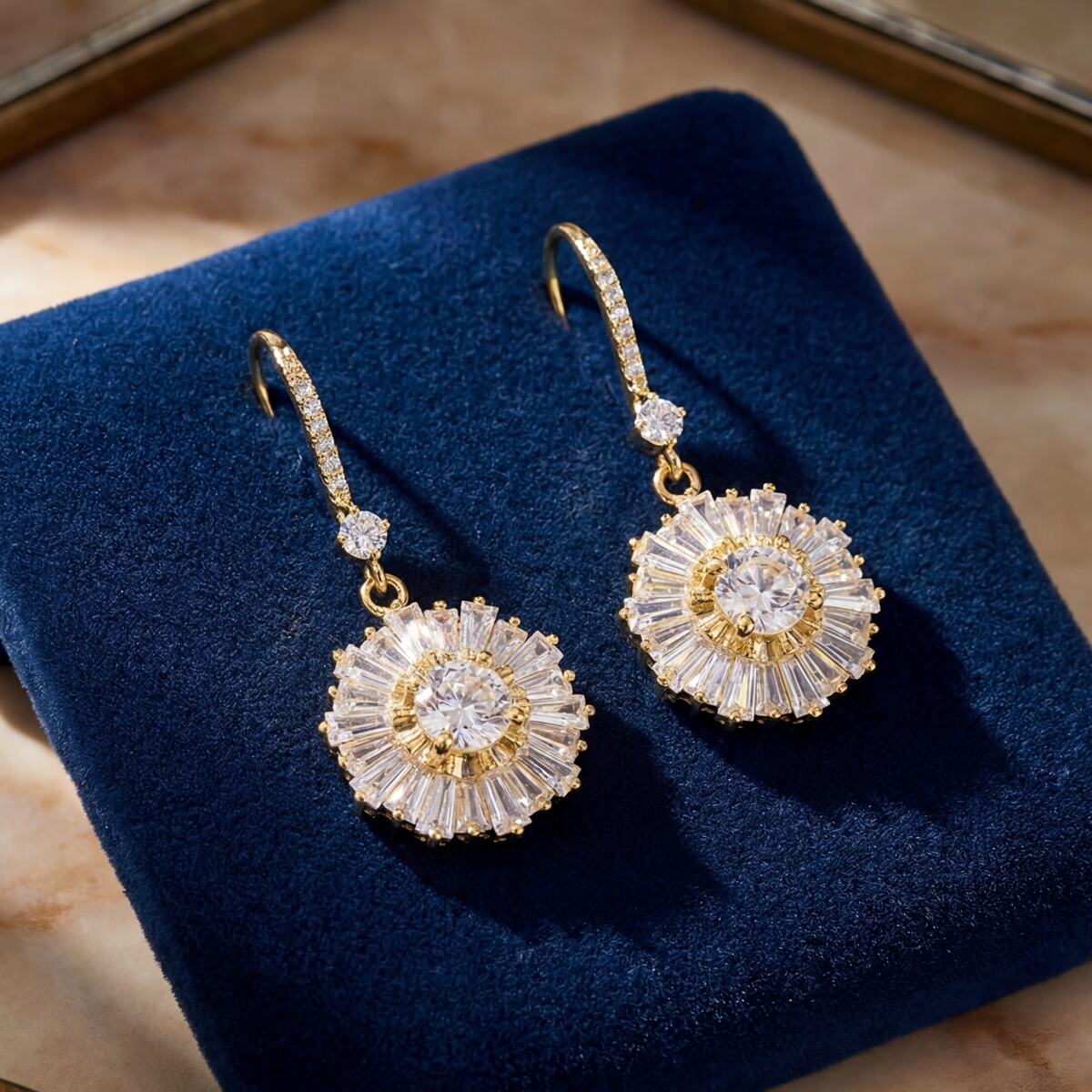Inspired by summer-blooming sunflowers, these light luxury drop earrings blend timeless elegance with eye-catching sparkle. Crafted from copper plated in 18K gold/rhodium and finished with hypoallergenic 925 sterling silver hooks (perfect for sensitive ears), the sunflower centerpiece features a round CZ core surrounded by radiating baguette CZs. Expert casting, polishing and micro-pavé setting create a 360° shine that glimmers like a tiny sun—with delicate pavé CZs on the hook for a seamless, refined finish.