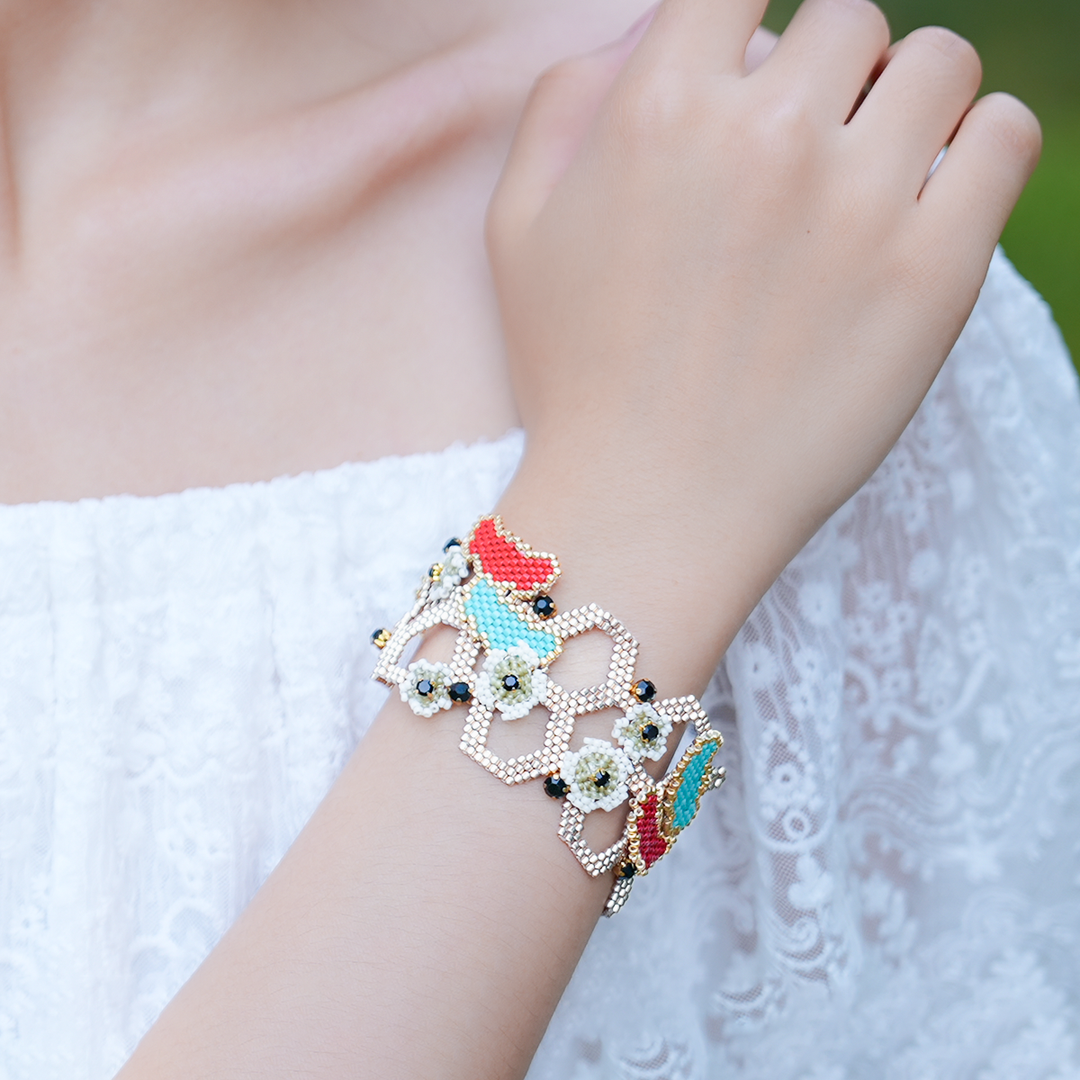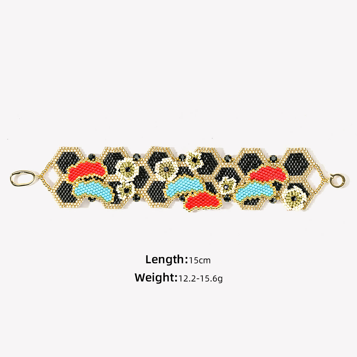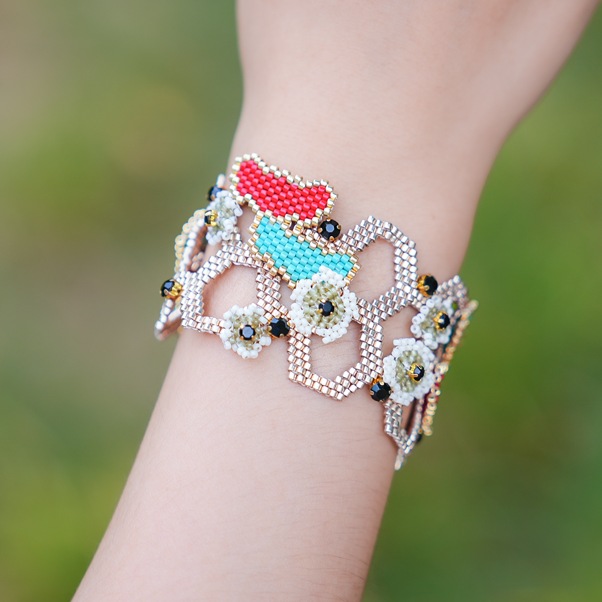 Bransoletka wykonana jest z wysokiej jakości, jednolitych japońskich koralików Miyuki, co zapewnia wyjątkową trwałość, intensywną retencję kolorów oraz gładką, luksusową powierzchnię. Strona czołowa prezentuje odważny, warstwowy wzór z kontrastowymi czarnymi, czerwonymi, turkusowymi i złotymi koralikami, podkreślony delikatnymi motywami kwiatowymi oraz błyszczącymi czarnymi detalami kryształowymi, tworząc bogaty, artystyczny wygląd. Strona odwrotna przedstawia skomplikowany, przepuszczający światło wzór plastra miodu w lśniącym kolorze złotym, tworząc elegancki, nowoczesny kontrast, który pozwala bez wysiłku zmieniać swój styl.