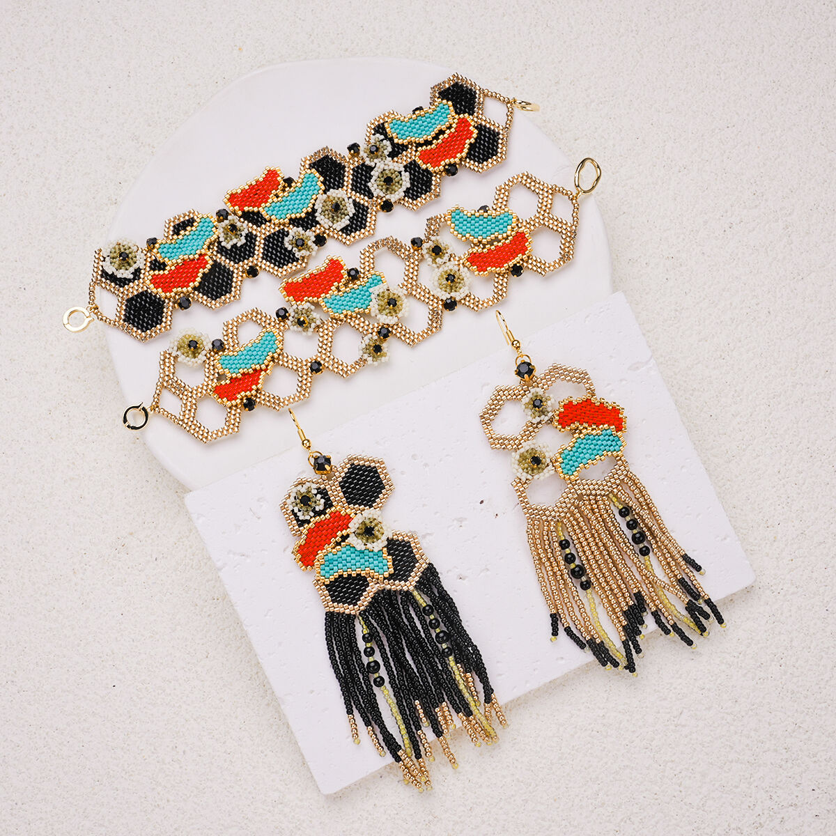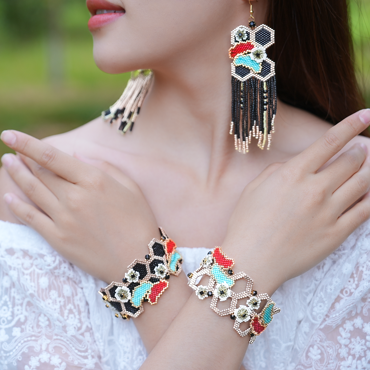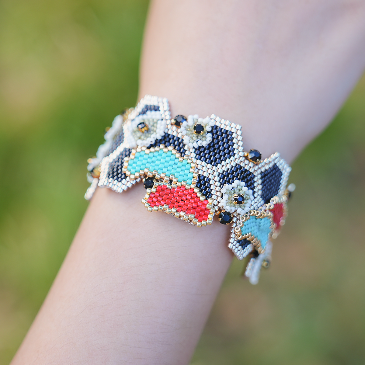 Bransoletka wykonana jest z wysokiej jakości, jednolitych japońskich koralików Miyuki, co zapewnia wyjątkową trwałość, intensywną retencję kolorów oraz gładką, luksusową powierzchnię. Strona czołowa prezentuje odważny, warstwowy wzór z kontrastowymi czarnymi, czerwonymi, turkusowymi i złotymi koralikami, podkreślony delikatnymi motywami kwiatowymi oraz błyszczącymi czarnymi detalami kryształowymi, tworząc bogaty, artystyczny wygląd. Strona odwrotna przedstawia skomplikowany, przepuszczający światło wzór plastra miodu w lśniącym kolorze złotym, tworząc elegancki, nowoczesny kontrast, który pozwala bez wysiłku zmieniać swój styl.