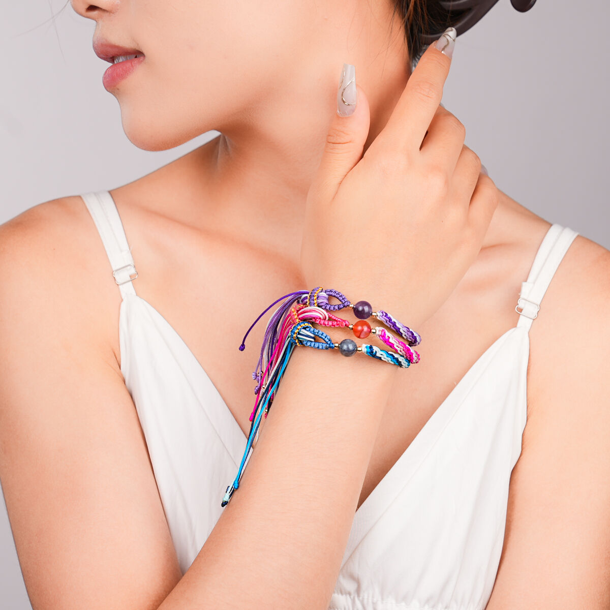 Wykonane z wysokiej jakości, trwałej politereftalowej nici impregnowanej woskiem oraz koralików z naturalnych kamieni, te bransolety zapewniają wyjątkowy komfort noszenia i długotrwałą intensywność barw. Każda bransoleta została starannie spleciona ręcznie z mieszanki nici w odcieniach pastelowych i intensywnych, wielobarwnych (m.in. różowej, fioletowej, niebieskiej, zielonej, żółtej i pomarańczowej), tworząc świeży i pełen życia styl boho, który doskonale komponuje się z dowolnym strojem.