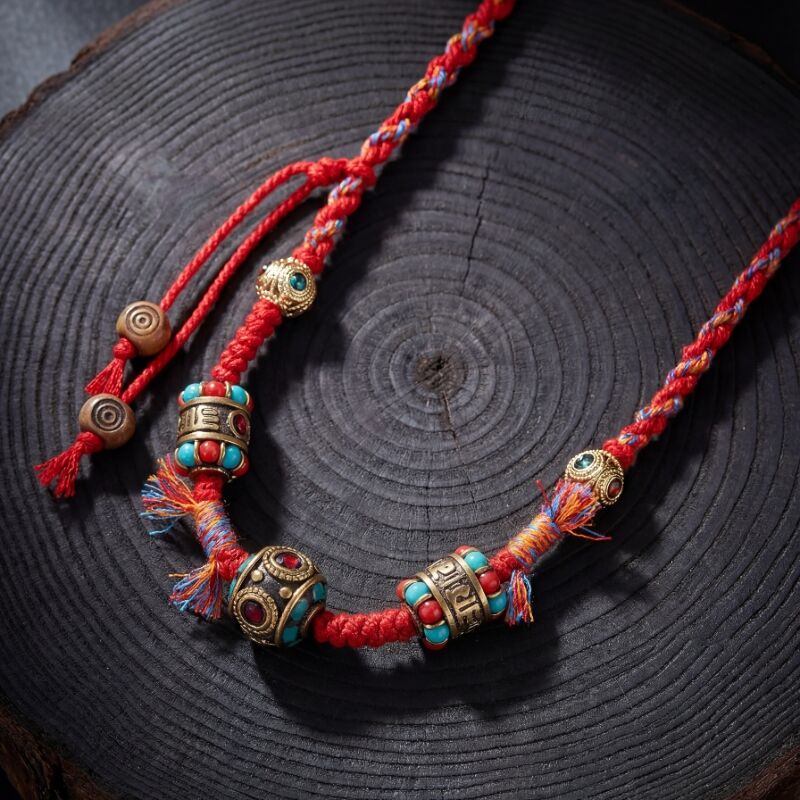 Handcrafted using traditional Tibetan braiding techniques, this necklace features a durable red cotton cord blended with orange and blue threads, creating a textured, vibrant weave that’s both sturdy and soft. The centerpiece is a copper Six-Word Mantra bead inlaid with colorful stones, flanked by symmetrical 3-Eye Wealth beads—all strung by hand for a secure hold. The cord finishes with an adjustable red tassel and wooden accent beads, delivering an authentic ethnic aesthetic that balances artistry with everyday wearability.