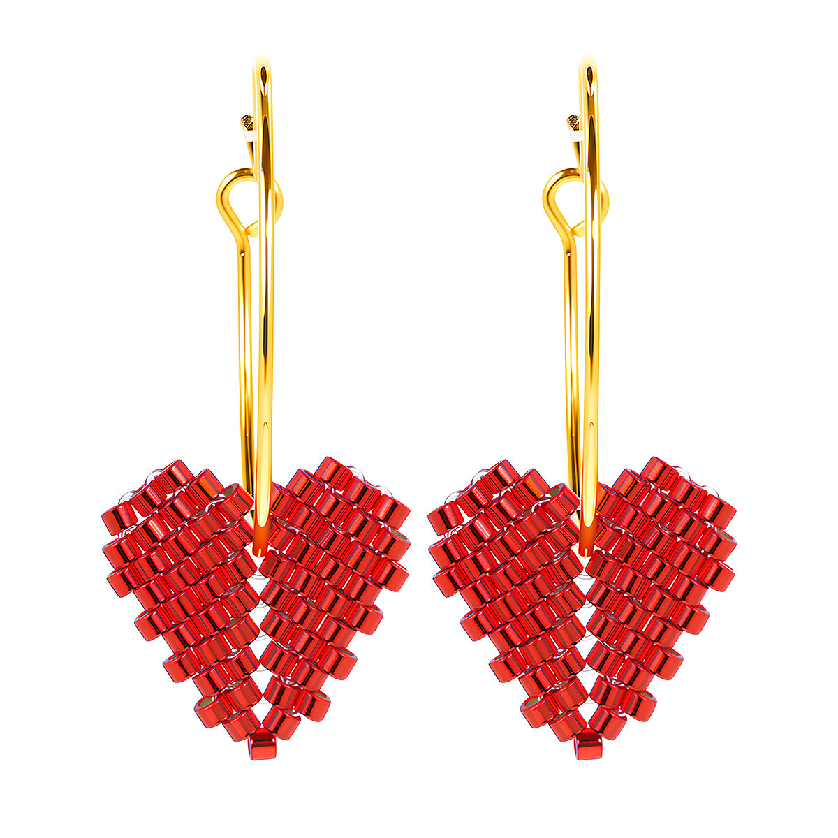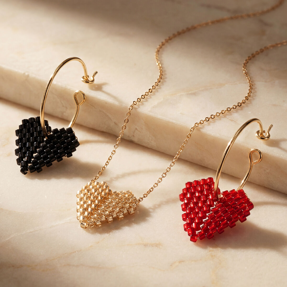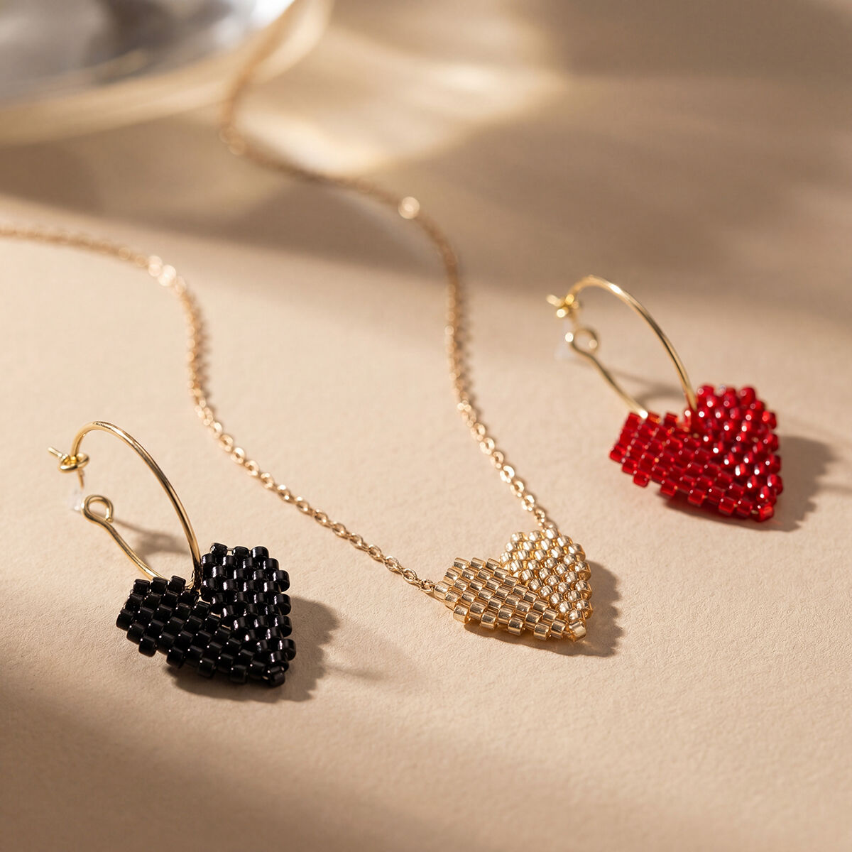 Orijinal Japon Miyuki Delica boncuklarla üretilmiştir; her bir boncuk, eşit boyut, pürüzsüz yüzey ve zarif doğal parlaklık için titizlikle seçilmiştir; bu özellikler, uzun süreli kullanım için solmaya ve şekil değişimine dirençlidir. 316L paslanmaz çelik halka kapanaklarla birleştirilmiştir; yüksek parlaklıkta işçilik, sorunsuz kullanım ve sağlam dayanıklılık sunar; hiperalerjeniktir ve oksidasyona karşı dirençlidir; hassas cilt için güvenlidir. Hassas boncuk dizilimiyle elle dokunmuştur; küpeler üç boyutlu, dolgun bir kalp şekli oluşturur; her parça, el yapımı sıcaklığı ve zarif detaylarla yüklüdür; seri üretim takıların homojenliğinden kaçınır. Klasik kırmızı ve siyah renklerde mevcuttur; çeşitli tarz ihtiyaçlarına uyar.